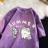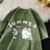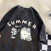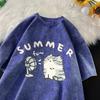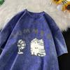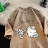 American Street Creative Blow Fan Cat Pure Cotton T-shirt Men Women Summer Relaxed Short Sleeve Couple Vintage Water Washing Top