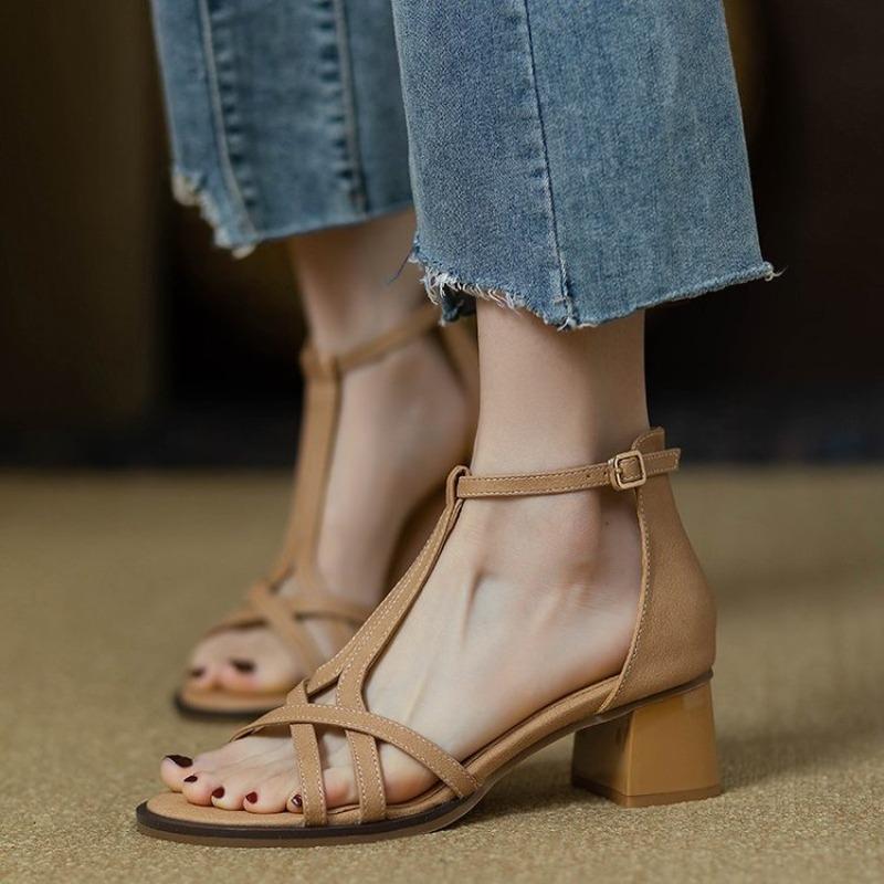 New Style of Mid-heel Cross-toe Sandals, Soft Leather Chunk-heeled Women's Shoes