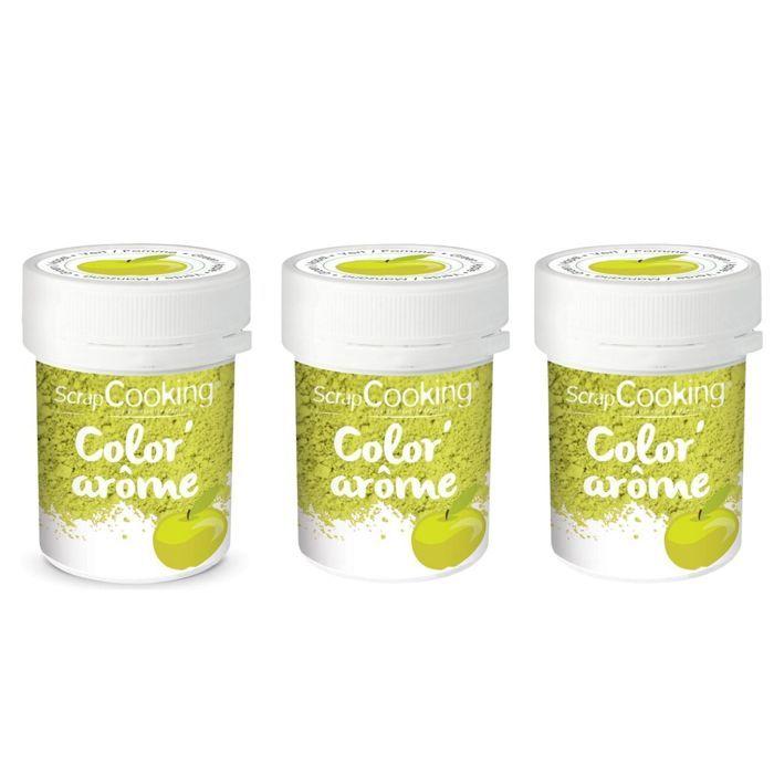 Color'Arôme vert pomme Vous allez désormais pouvoir à la fois parfumer et colorer vos gâteaux et toutes vos pâtisseries grâce à la nouvelle gamme Color'arôme de ScrapCooking. Avec le Color'arôme vert, vous donnerez à vos pâtisseries le délicieux goût de la pomme tout en les colorant d'un beau vert prairie. Les colorants arômes alimentaires s'utilisent également pour vos glaçages, macarons, yaourts, entremets… Découvrez également les autres produits de la gamme Color'arôme : vert-pistache, jaune-citron, rose-fraise, rose-framboise, violet-mûre, orange-abricot et bleu-myrtille. Préparation colorante aromatisée - Ingrédients : arôme, colorants : E102*, E132. Peut contenir des traces de fruits à coque, arachides, gluten, œufs, lait, graines de sésame, céleri, moutarde.*Peut avoir des effets indésirables sur l'activité et l'attention des enfants. Conseils d'utilisation : à conserver à l'abri de la lumière et de l'humidité après ouverture. Pour denrées alimentaires : utilisation limitée. Ne pas ingérer en l'état. Ne pas inhaler. Ne pas mettre dans les yeux. Mode d'emploi : +/- 1g de Color'arôme pour 100g de préparation. Fabriqué en France. 3 pots de 10 grammes. Le vendeur confirme que ses produits sont conformes à toutes les lois applicables et ne sont proposés que s'ils sont conformes aux politiques de Joom et aux lois européennes sur la sécurité et la conformité des produits.