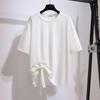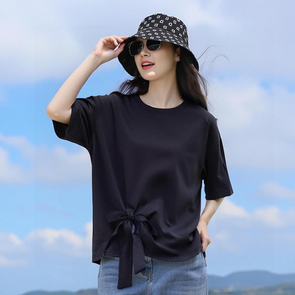 This Plus Size Lace-Up Bow T-Shirt is the perfect addition to your 2024 summer wardrobe. Crafted from soft and breathable cotton, this casual top ensures comfort while providing a slimming effect. It features a solid pattern with a charming bowknot decoration, adding a touch of femininity to your look. The round neckline and short sleeves offer a classic and versatile style, making it ideal for casual outings or relaxed summer days.