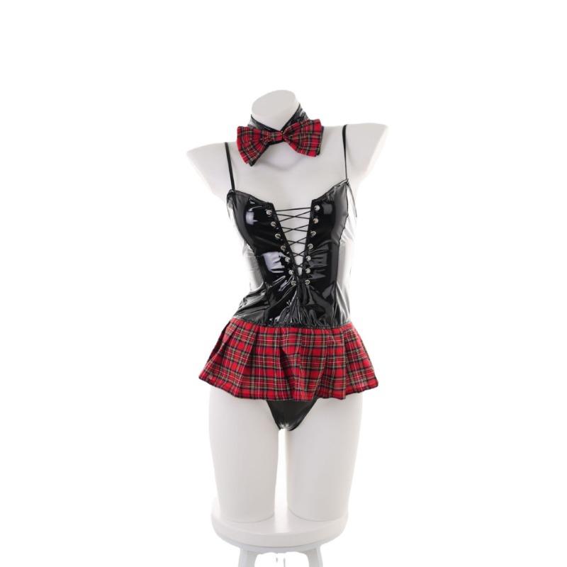 Sexy Lingerie Sexy Suspender Patent Leather Red Checked Skirt Uniform Bunny Temptation Straps Student Uniform Leather Jacket