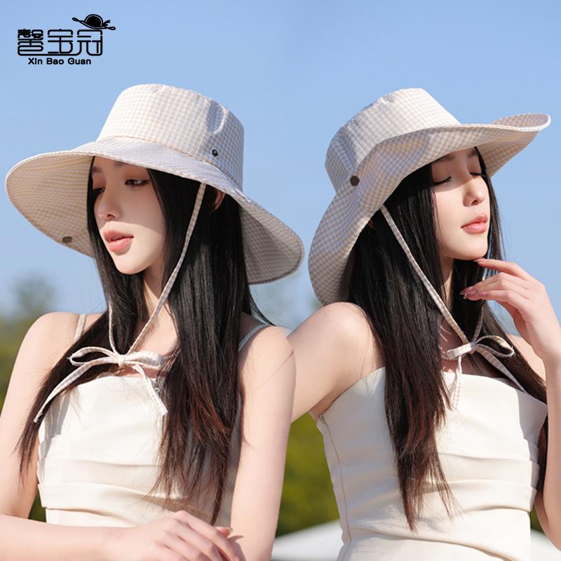 Plaid big eaves hat children summer outdoor travel sunshade bucket hat show face small versatile sunscreen sun hat