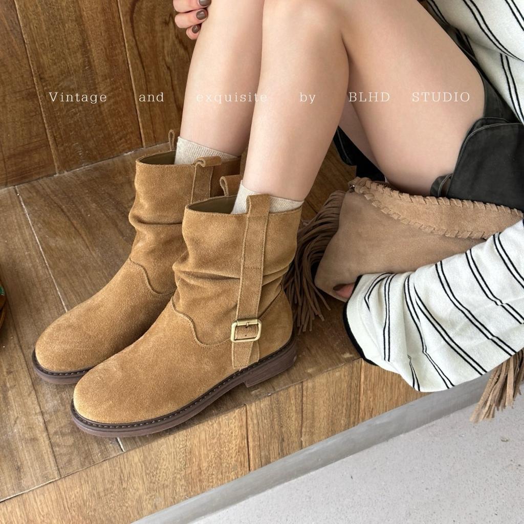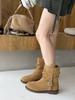 2025 autumn retro suede V-mouth western cowboy boots pointed mid-tube boots medium antique belt buckle stacking boots