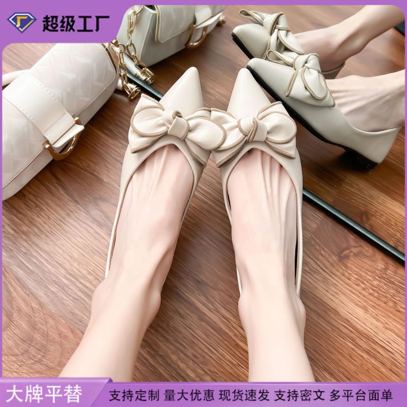 Bow pointed single shoes women's soft soles are not tired feet thick heels flat shoes light luxury comfortable soft leather work shoes versatile