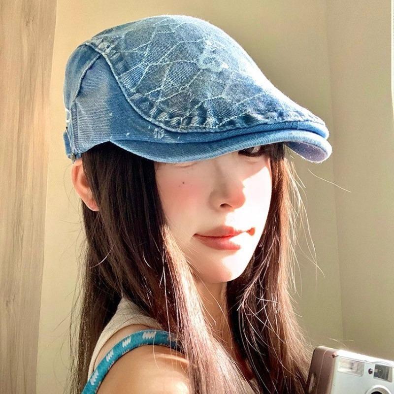 Washed cowboy forward hat, women's versatile big head circumference, wearing a duck tongue beret to show the face, small hat spring and autumn