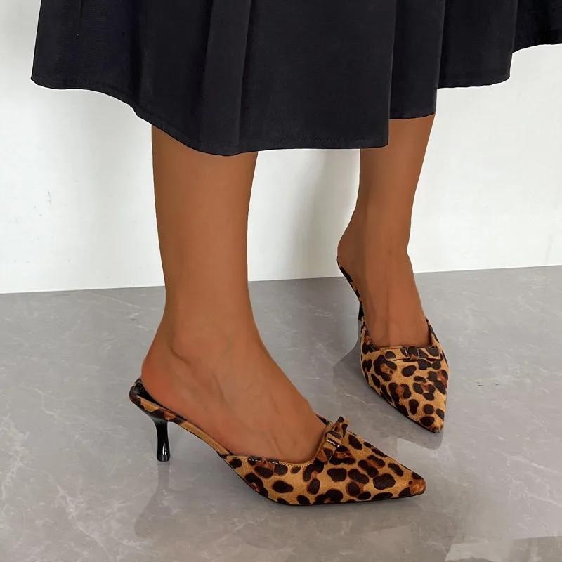 Fashion Women's Medium Heel Slippers Leopord Pointed Toe Thin Heels Shoes Women Dress Cover Toe Fashion Sexy Summer Zapatillas De Mujer