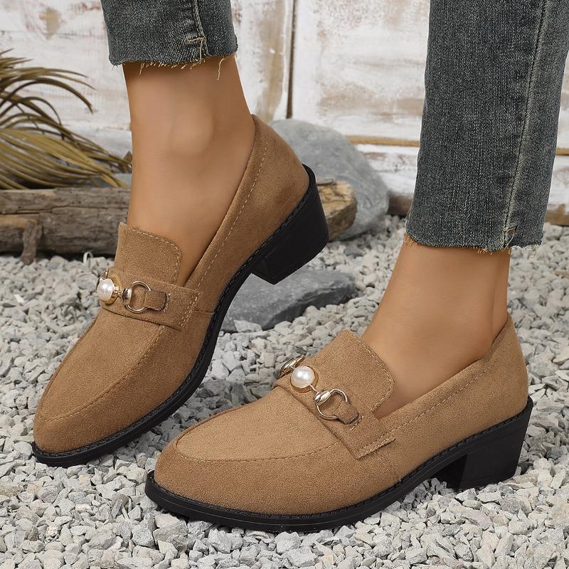 Fashion Women Pumps 2025 Spring Autumn New Pearl Square Heel Loafers for Woman Plus Size Retro Suede Pointed Commuter Slip-On Shoes