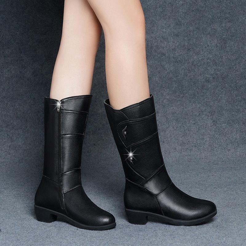 Modă Toc Mediu Vârf Rotund Piele Cizme Medii pentru Femei Toamnă Iarnă Negru Cald Pantofi Chic și Eleganți din PU