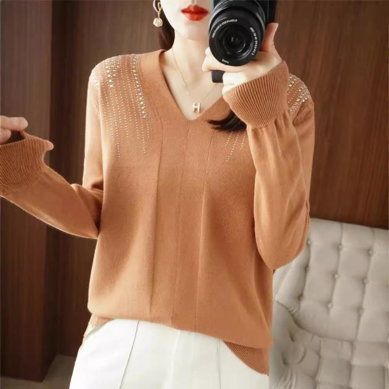 Summer new V-neck shoulder hot diamond knitted sweater women's solid color loose temperament versatile long-sleeved top