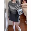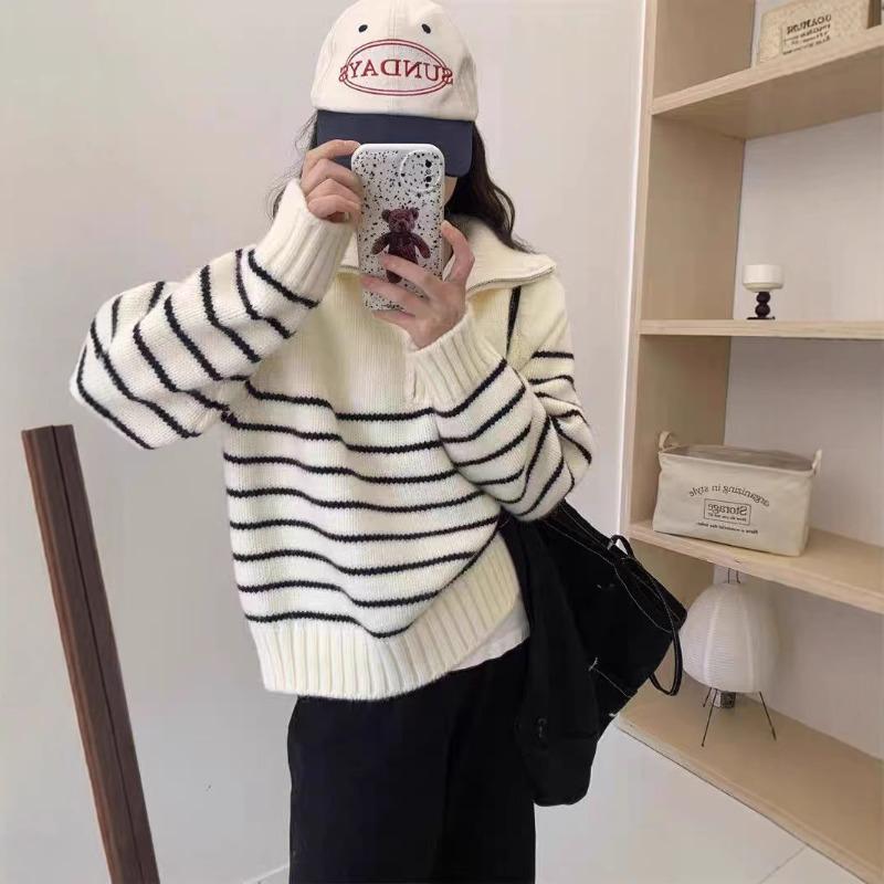 Autumn and winter new lazy style versatile knitted sweater half zipper lapel loose and thin striped sweater women