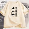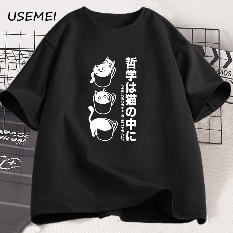Funny Kawaii Cat T-Shirt Japanese Cat Coffee Lover T Shirt Men Women Streetwear Harajuku Clothing Cute Black Cat Tee Loose Tops