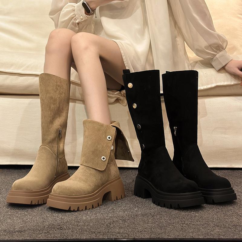 Fashion Design Thick Sole Height Increase Long Boots Women Suede Mid Calf Knight Boots Chunky Heel Warm Western Boots Casual Women Shoes