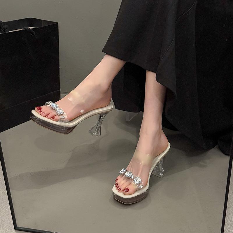 Fashion Block Heel Rhinestone Sandals Summer New Square Toe Open Toe Platform Sheer Strap Crystal High Heel Slippers