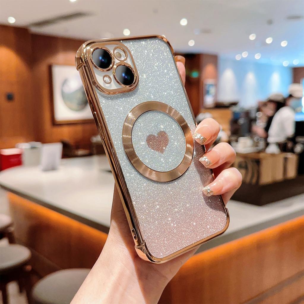 For iPhone 15 Case Compatible with MagSafe Gradient Love Heart Electroplating TPU Phone Cover