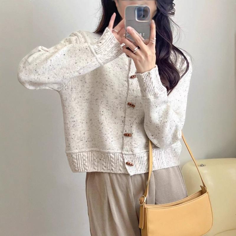 Autumn new round neck flower dot knitted cardigan loose and thin design short sweater women's coat