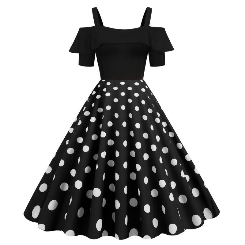 Women's S S Hepburn retro suspender ruffle edge short sleeve black polka dot pendulum dress
