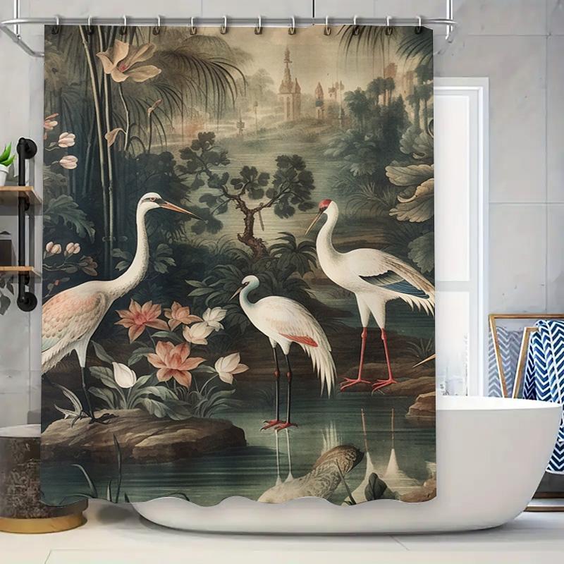 Exquisite Oriental Bird Bathing Curtains Vintage White Crane Print Shower Curtain for Bathroom Decoration