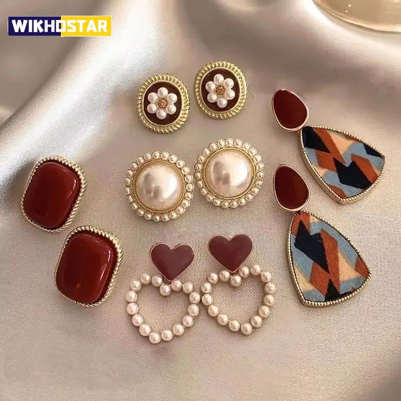 Cercei vintage retro roșu vin cu ulei picurător pentru femei, cercei coreeni cu perle, floare, inimă, geometrici, bijuterii de înaltă calitate