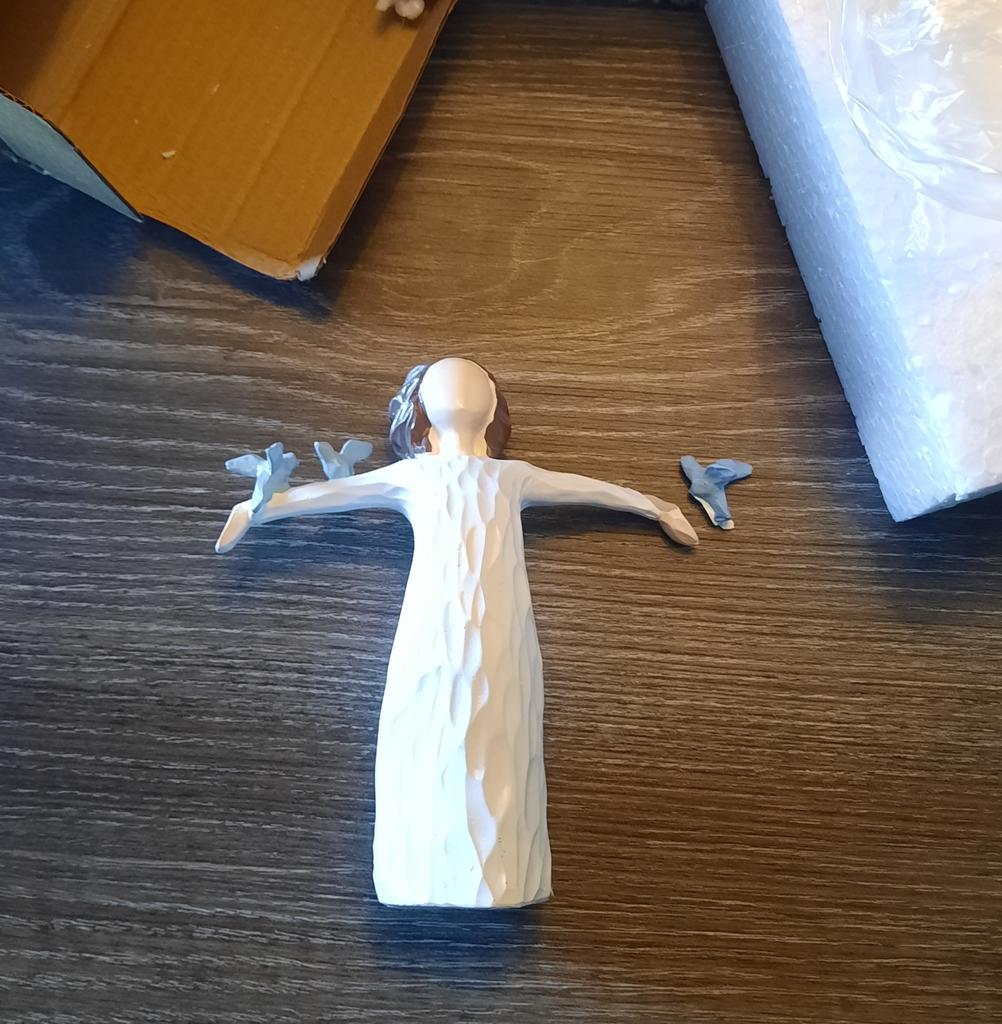 Figurina a sosit spartă. Una dintre păsări era ruptă. De asemenea, aceasta nu este aceeași figurină ca cea prezentată în fotografia produsului de pe site, ci o replică ieftină a figurinelor Willow Tree. Fotografiile folosite pe site sunt fotografia produsului de la produsele frumoase Willow Tree, care nu are nicio legătură cu această copie ieftină din rășină. Sunt foarte dezamăgită și mă simt ca și cum am fost păcălită.