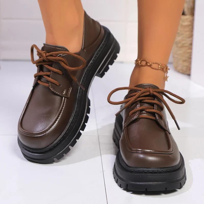 Fashion Vintage Round Toe Loafers Shoes for Woman Classic Lace-Up Pu Leather Ladies Single Shoes Office&career Thick Hole Pumps Mujer