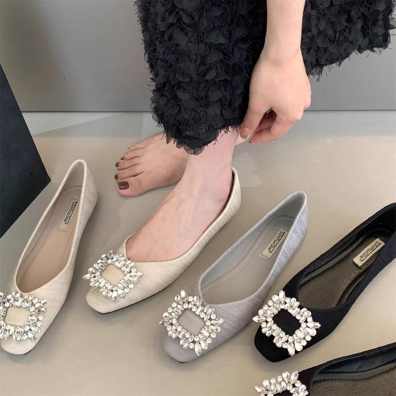 Fashion Flat Shoes Women's Rhinestone Square Buckle Shallow Mouth Spring and Autumn Flat Bottom Casual Plus Size Women's Shoes