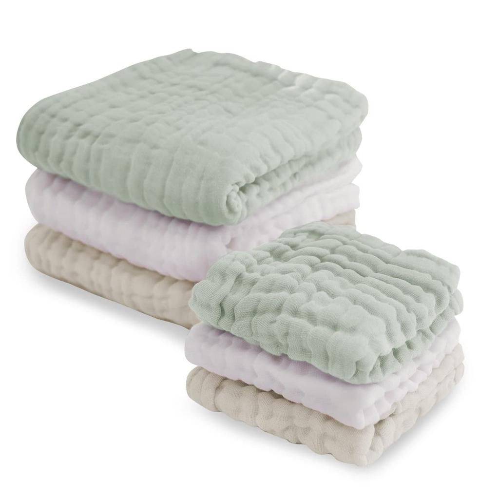Keratta Ibul Baby Bath Gauze Handkerchief Towel Set (6-Piece Set) in Muted Colors (Green, Beige, and White)
