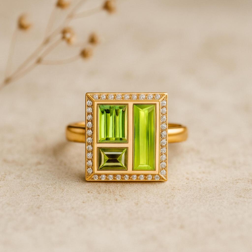 Faceți o declarație îndrăzneață, dar elegantă, cu acest inel uimitor cu peridot tăiat baghetă, accentuat de un halo strălucitor de zirconiu cubic rotund.. Designul geometric unic prezintă peridote multiple tăiate baghetă, montate într-un cadru pătrat modern, creând un aspect vibrant și artistic.
