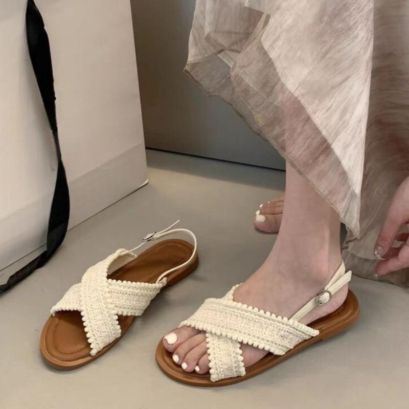 Fashion 2025 Fashion Women Sandals Ladies Flat Roma Heels Knitted Summer Sandals Outside Cross Tied Leather Female Slides Woman Sandals