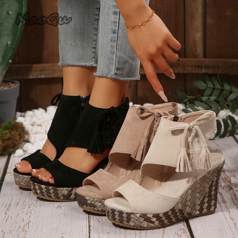 Fashion High Heel Platform Sandals for Women Footwear Fringe Decor Side Zipper Fish Mouth Thick Bottom Shoes Wedge Sandalias Femininas