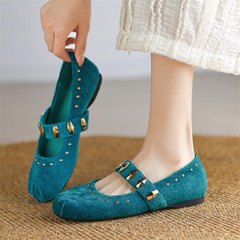 Fashion New Spring/Summer Cow Suede Women Pumps Shoes for Women Fashion Rivet Round Toe Mary Jane Shoes Low Heels Flat Shoes Women