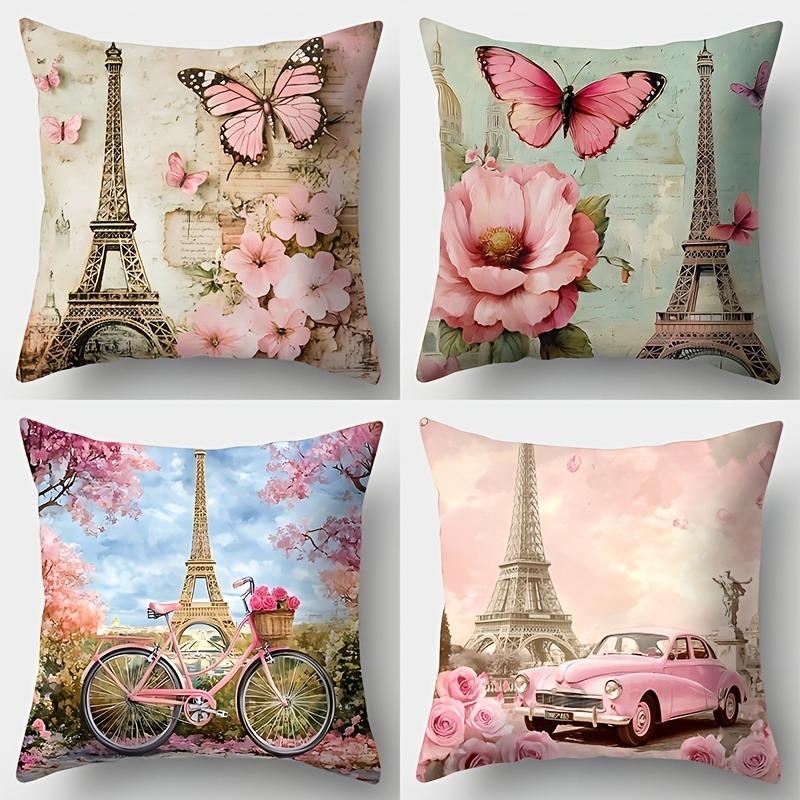 Romantic Paris Eiffel Tower & Pink Car PillowcaseLiving room sofa cushion cover, soft and comfortable, bedroom room decoration