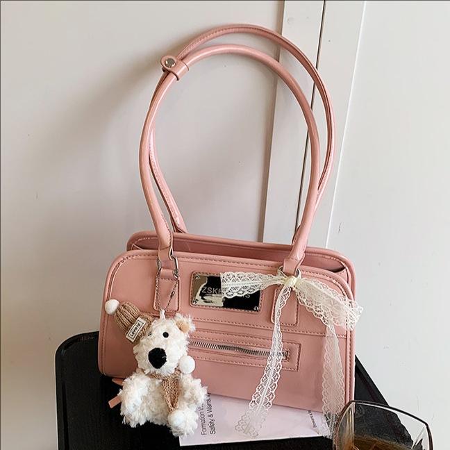 - **Structured Shoulder Bag Details**: Features a sleek structured silhouette with glossy PU finish, a branded plaque, long shoulder straps, a decorative lace bow, and an optional plush bear charm accessory, exuding retro and stylish charm. Multiple color options (Coffee, Silver, Black, Pink, White) with or without the accessories cater to diverse style preferences.
