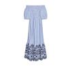 Summer Women clothes Honeycomb Lattice Elastic Design Embroidery Stripe off-the-Shoulder Straight Collar Midi Dress 3295889