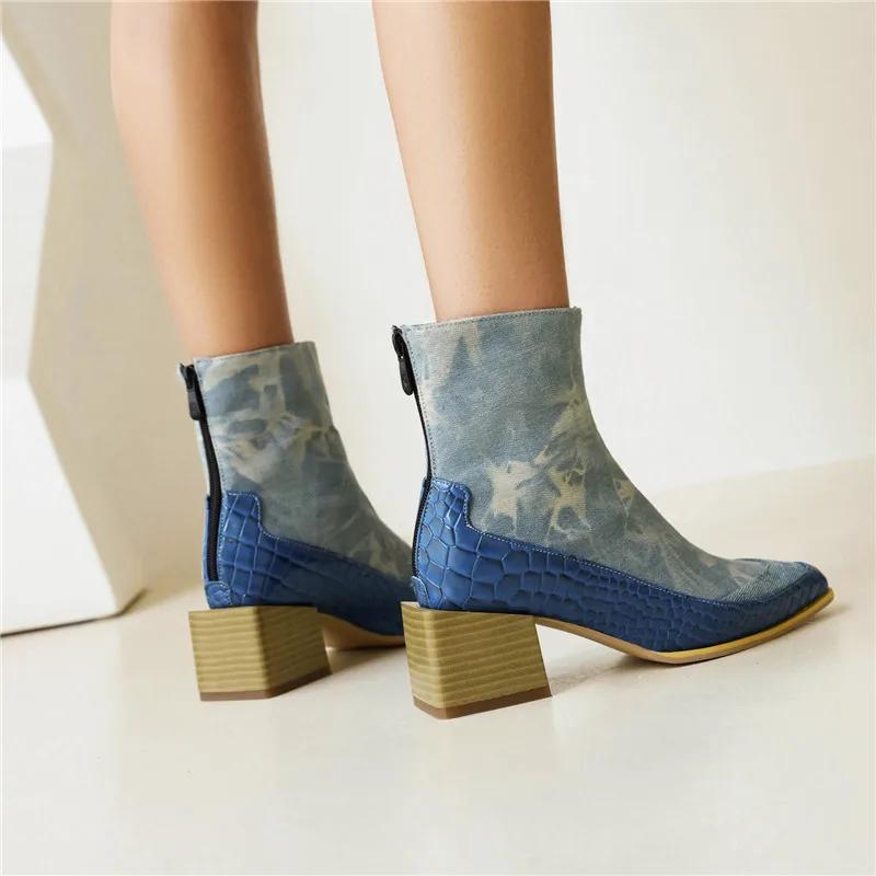 Stylish Women's Square Toe Denim Ankle Boots High Block Wooden Heels Winter Autumn Big Size Ladies Blue Jeans Zipper Short Boots
