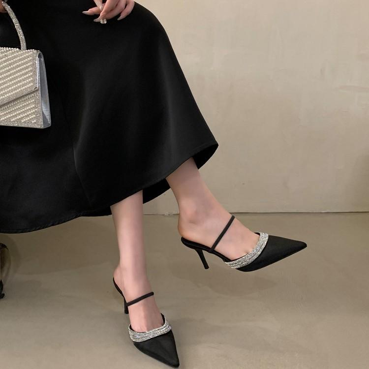 2025 spring rhinestone decorative satin surface pointed head thin heel high heel sandals women's shoes bag head shallow mouth half drag European and