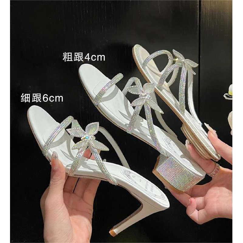 RC rhinestone sandals~ 2025 summer new bow with stiletto slippers women's fashion high heels