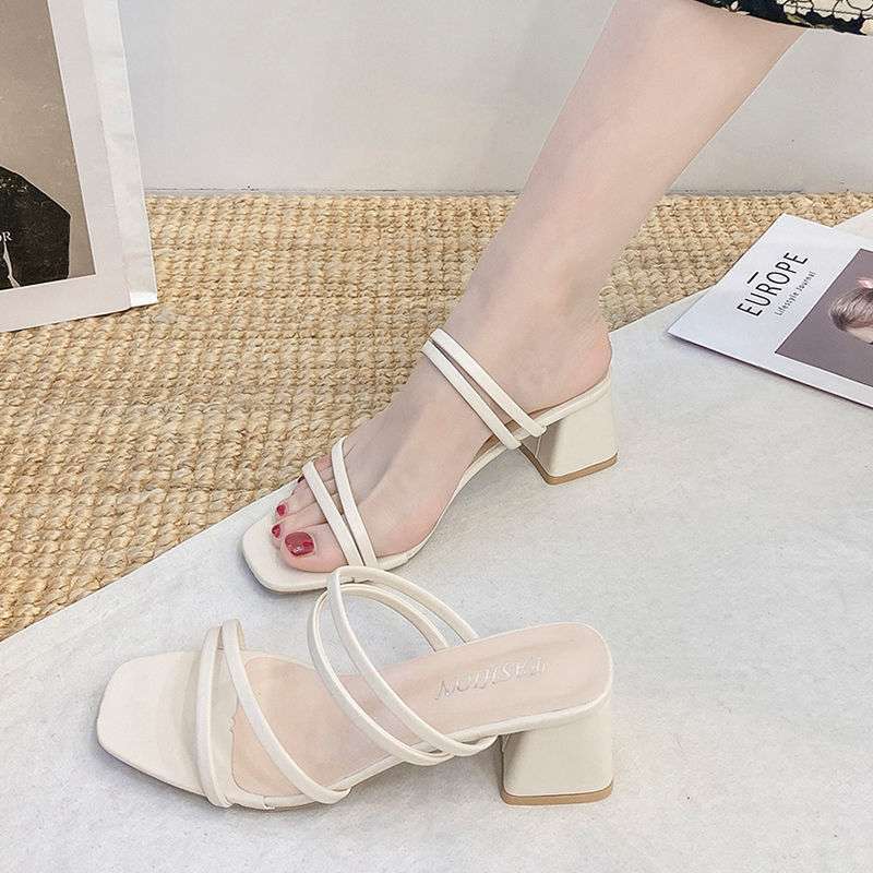 Fairy wind word with sandals summer 2025 new versatile medium heel thick heel high heel half slippers ins tide