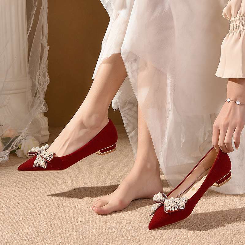Red wedding shoes women's spring 2025 new flat-soled bride shoes are not tired, pregnant women can wear Xiuhe wedding dresses twice