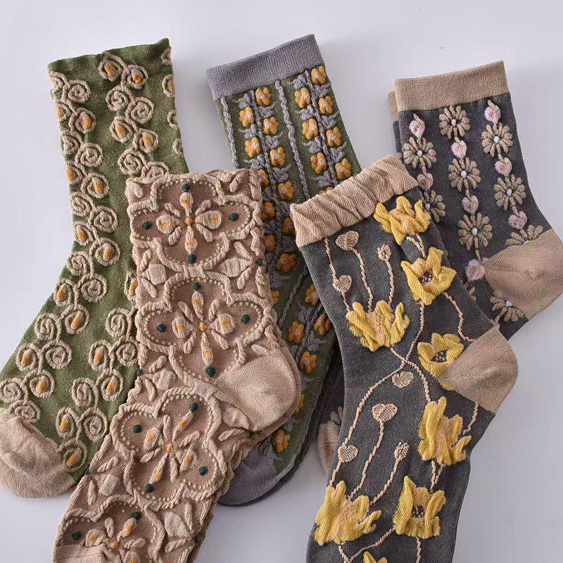 Șosete Vintage Embosate Florale de Cafea până la Mijlocul Gambei pentru Femei - Stil Literar de Curte Toamnă/Iarnă