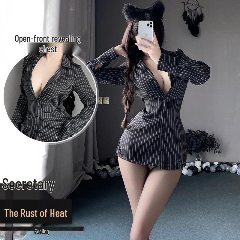 Elegant Striped Secretary Lingerie Set - Black Long Shirt with Removable Details