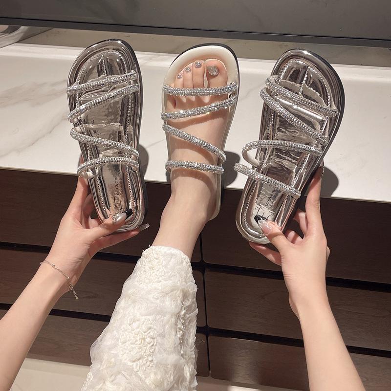 Rhinestone slippers women's summer wear 2025 new Internet celebrity versatile niche high-end flat bottom cool beach mop