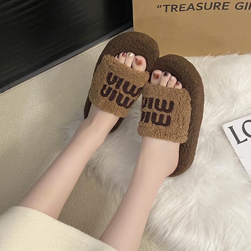 Thick-bottomed letter fluffy slippers women's outerwear 2025 new autumn and winter lamb fluffy fashion home cotton slippers