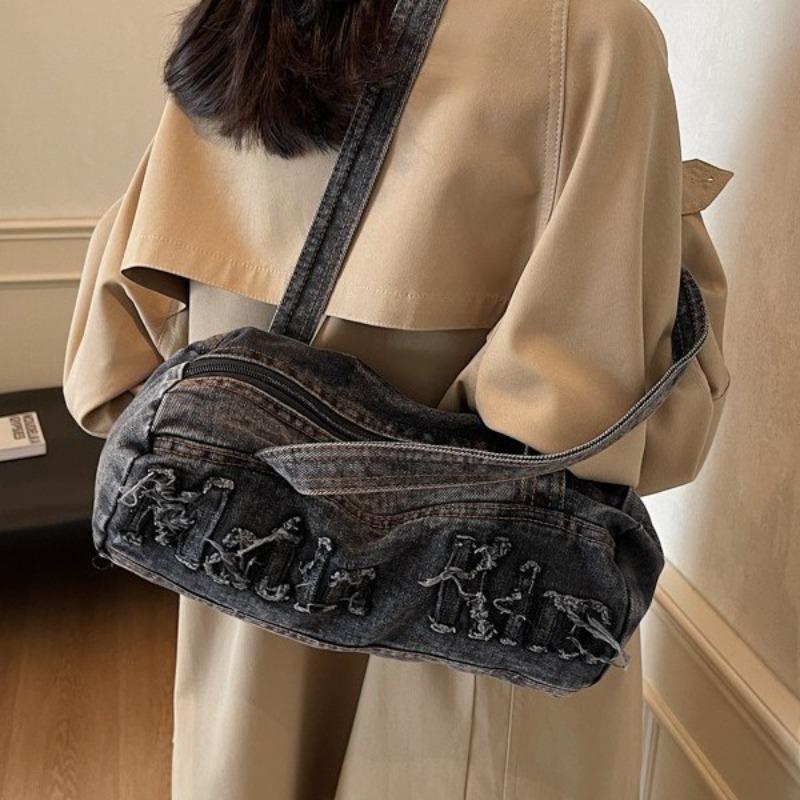 Denim shoulder bag, retro bag, embroidered tote bag, large capacity fashion bag, portable pillow bag.