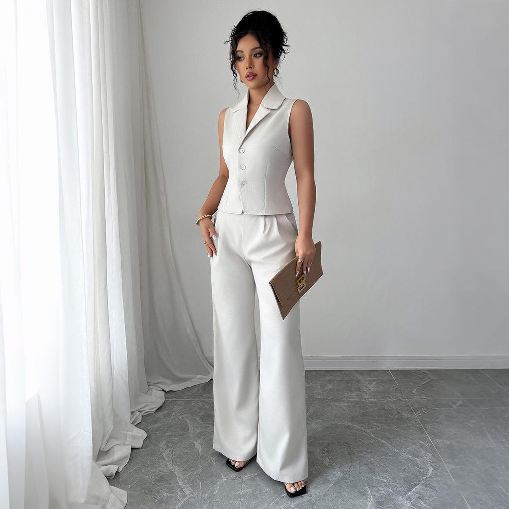 Elevează-ți garderoba de vară cu acest set șic vestă și pantaloni. Confecționat din poliester durabil, țesătura oferă atât confort, cât și stil.. Acest ansamblu prezintă un design elegant cu un model uni, perfect pentru un stil versatil.. Setul include un veston cu nasturi și pantaloni lungi, întruchipând o fuziune de eleganță franceză europeană și americană, făcându-l o alegere ideală pentru diverse ocazii.