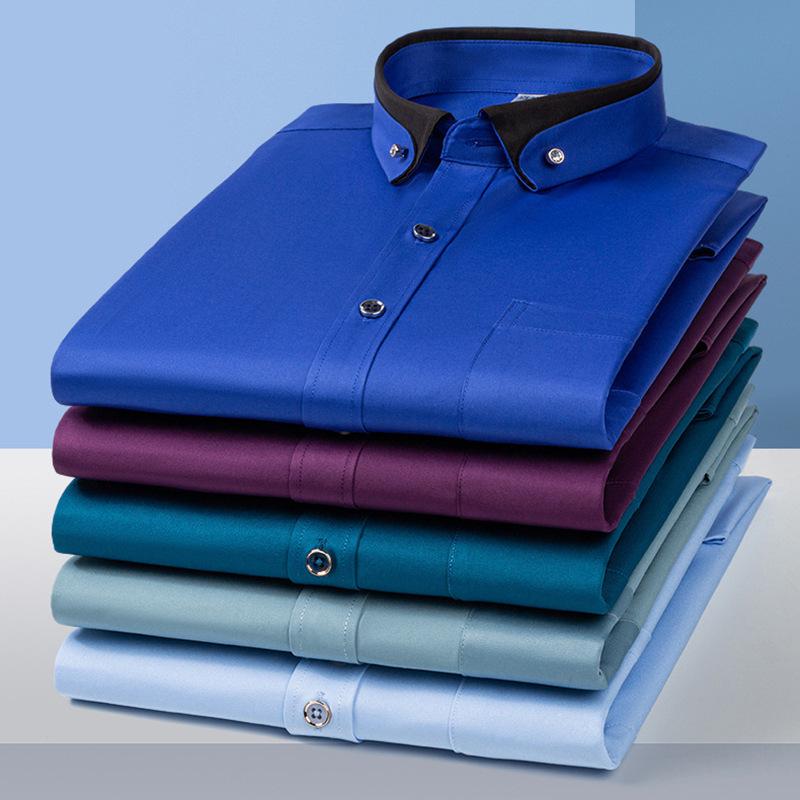 This men's business casual shirt is perfect for spring and autumn, offering a blend of style and comfort. Crafted from stretch polyester fabric, it ensures ease of movement while maintaining a polished look. The shirt features a solid pattern and a unique square neckline with a contrast collar, adding a modern touch to your wardrobe. With its long sleeves and non-iron design, it's convenient and ideal for a busy lifestyle, keeping you looking sharp all day.