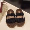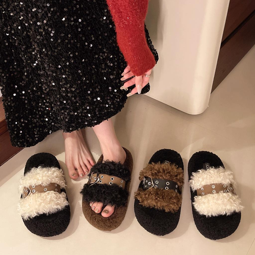 Thick-bottomed curled fluffy slippers for women's outer wear, velvet warm and fashionable one-word belt buckle 2025 autumn and winter new cotton sl