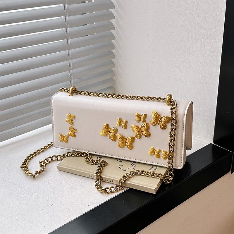 Premium texture chain underarm small square bag pastoral style shoulder messenger bag butterfly baguette bag women