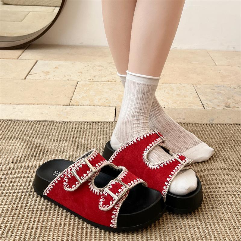 Popular retro red thick-soled one-word slippers for women's summer wear 2025 new models with skirts French Birkencool slippers
