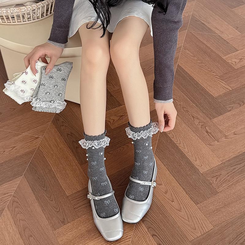 Female Spring and Autumn Sweet Lace Lace Pin Bead Bow Ballet Style Boneless Drum Pile Socks