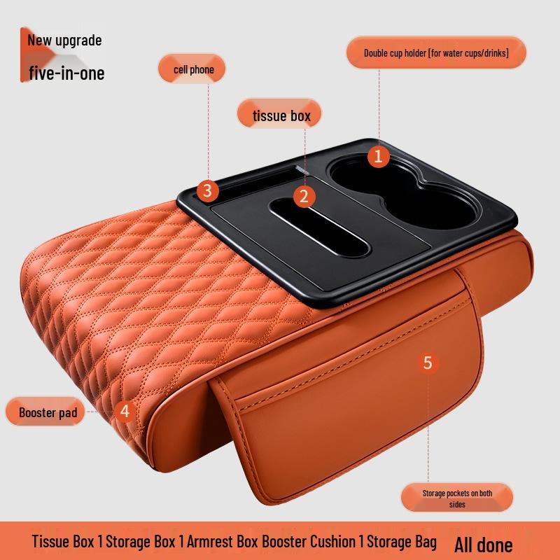 Car Armrest Pad with Console Riser, Tissue Box, Cup Holder & Protector 5-in-1